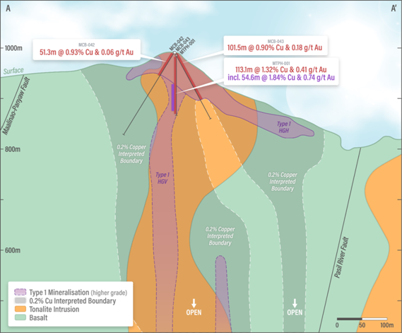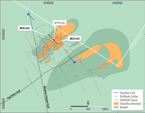 · See Figure 2 for representative Cross Section of the Geology and its relationship to the copper-gold mineralisation at MCB for drill hole MCB-042, MCB-043, and MTPH-001. |