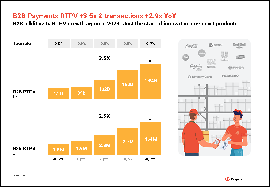 Over the last year, Kaspi Pay B2B has emerged as a fast-growing component of our RTPV. Our B2B proposition connects small merchants with wholesalers, distributors and manufacturers, allowing invoices to be settled instantly and conveniently. During the fourth quarter of 2022, B2B RTPV increased 3.5x year-over-year to KZT194 billion and reached 3% of RTPV. We expect B2B to continue growing significantly faster than Payments RTPV in 2023.