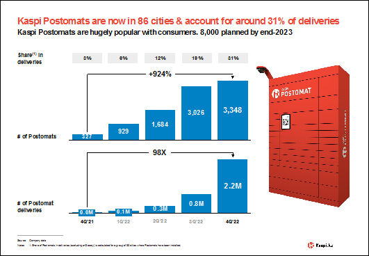 · 3,348 Kaspi Postomats operational in December across 86 cities, accounting for 31% of orders delivered. Around 8,000 lockers planned by end-2023.