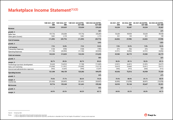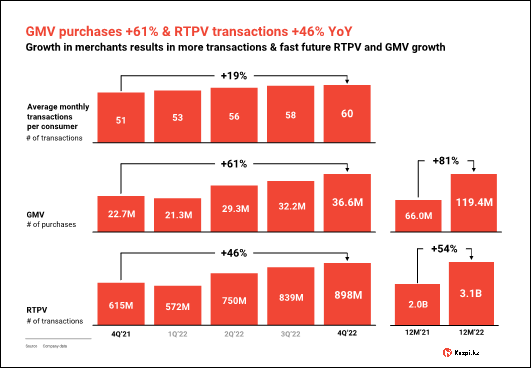 Over 2022 Marketplace GMV momentum accelerated, with growth reaching 60% year-over-year and GMV of KZT1 trillion in the fourth quarter of 2022. For full-year 2022, GMV increased 56% to KZT2.9 trillion.