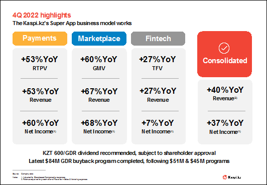 In the fourth quarter of last year, the underlying growth drivers of our business remained strong. Merchant onboarding to Kaspi Pay, m-Commerce and e-Commerce increased 101% year-over-year, to reach 485K active merchants. Average monthly transactions per active consumer reached 60 per month, with revenue generating payment transactions (RTPV) and Marketplace purchases up 46% and 61% year-over-year respectively. Strong operating trends, translated into above guidance 2022 financial results.