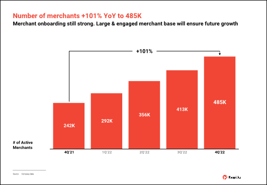 To drive transactions even higher, we have prioritised onboarding as many merchants, as rapidly as possible. During the fourth quarter of 2022, the total number of active merchants increased 101% year-over-year to reach 485K. We expect our merchant base to continue seeing solid growth in 2023.