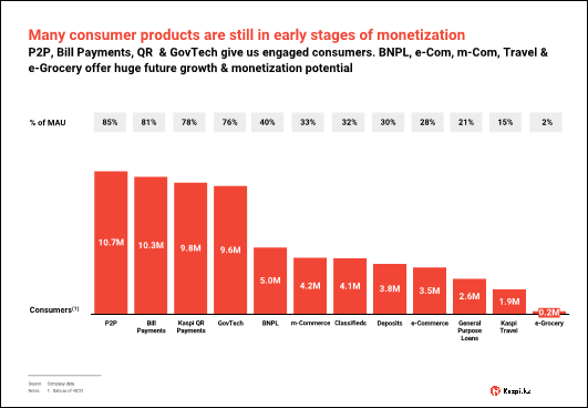 P2P, Bill Payments, BNPL, Kaspi QR and our GovTech Platform are fundamental to high day-to-day consumer engagement. Going forward, we will grow less mature services including e-Commerce & Postomats, all aspects of Kaspi Travel, e-Grocery and Kaspi Classifieds. These services help our consumers discover the products they need, at the best possible prices, from local merchants, with free delivery, saving time and money. With consumer penetration across our full range of Super App services still low, here too the opportunity ahead remains significant.