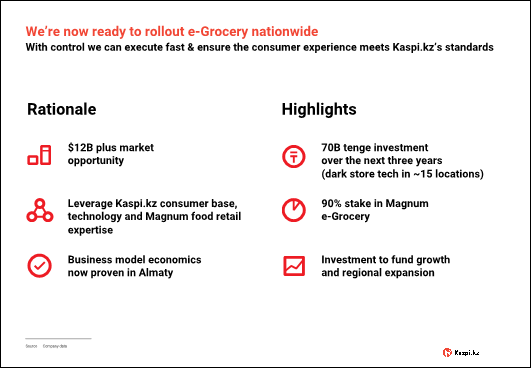 We chose to form a joint venture with Magnum because they're the country's no.1 food retailer, with a nationwide presence. We have now taken steps to formalise this relationship, with Kaspi.kz committing invest around KZT20-25 billion per annum over the next 3 years. Our equity ownership in e-Grocery is 90%, with the remaining 10% owned by Magnum and e-Grocery's management. Magnum will continue to bring their food retail expertise, especially market leading purchasing terms. Our main role remains the front-end user experience, while our data expertise allows us to efficiently define assortment and pricing. With the control that we now have, we intend to execute fast and can ensure all aspect of the consumer experience meet Kaspi.kz's high standards.