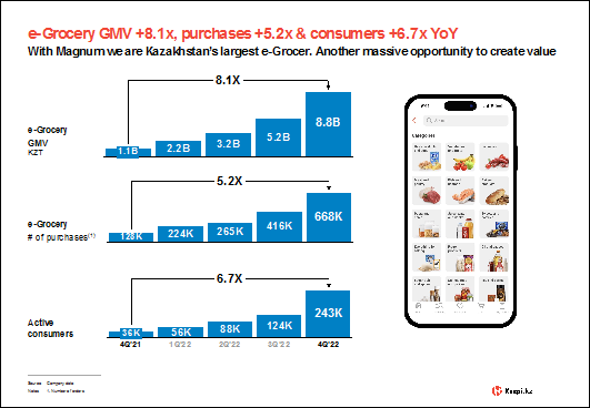 During the fourth quarter of 2022, e-Grocery GMV reached KZT8.8 billion, up 8.1x year-over-year. Over the same period, 243K consumers made 668K orders, up 6.7x and 5.2x respectively. Average ticket is currently around $25. Having delivered strong growth since launch in 2021, e-Grocery is now one of our most important priorities and expected to be additive to mid-term growth.