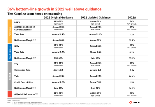 For 2022 we delivered adj. net income growth of 36% year-over-year, well ahead of the 20-30% guidance we started the year with. At a time when many leading internet companies around the world are kitchen sinking their earnings outlook and firing employees in order to become profitable, our performance stands out for the right reasons. The Kaspi.kz Super App strategy works and our team knows how to deliver. We also generated 59% of net income in 2022, from our Payments and Marketplace Platforms. Their faster growth creates disproportionately more value for our shareholders.