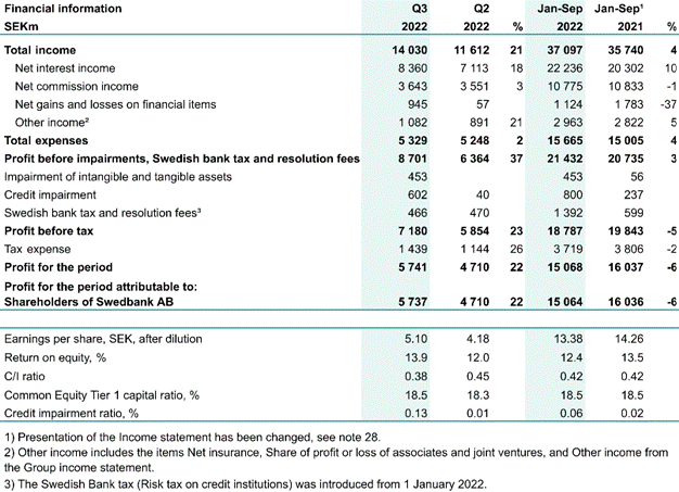 This disclosure contains information that Swedbank is obliged to make public pursuant to the EU Market Abuse Regulation (EU nr 596/2014) and the Swedish Securities Markets Act (2007:528). The information was submitted for publication, through the agency of the contact person, on October 27, 2022, at 07:00 CET.